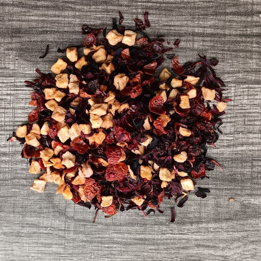 Bold, tangy, and sweet apple. PuckerUp Tea is a refreshing blend that combines the tartness of hibiscus and the sweetness of apples, balanced by the floral notes of rosehips and a natural apple flavor. This vibrant tea offers a burst of antioxidants from hibiscus and rosehips, supporting immune health and promoting healthy skin. The apples provide a natural source of fiber and vitamins, while the blend's tangy profile helps to boost hydration and refresh the palate. Ideal for those looking for a caffeine-free, rejuvenating drink that supports overall wellness while offering a delightful and zesty flavor.