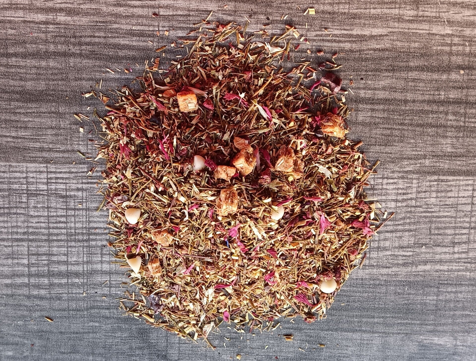 Ingredients: green rooibos tea, apple pieces, mini white chocolate chips, cocoa nibs, raspberries, natural raspberry flavor, white chocolate flavor, red cornflowers & white cornflowers